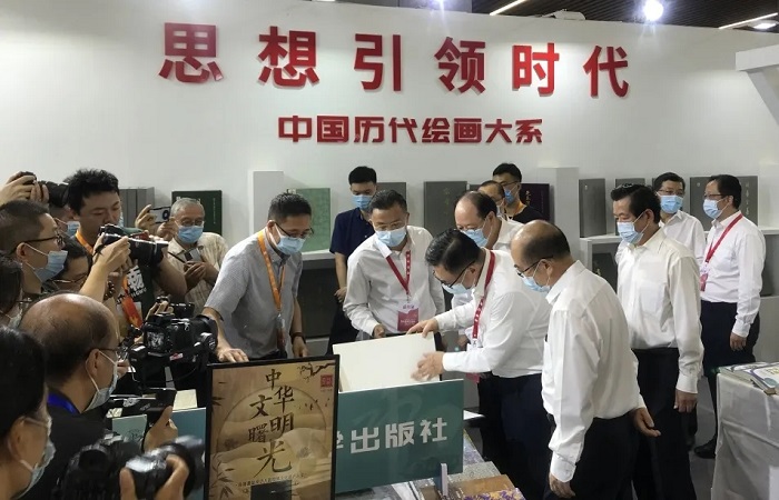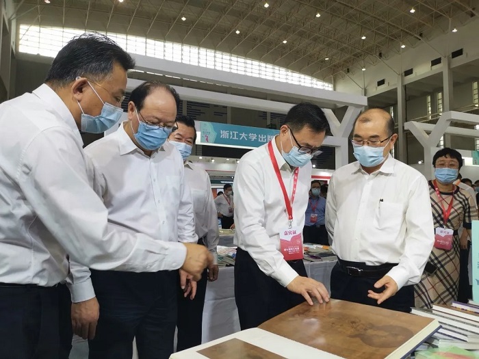 10月9日开幕当天,浙江省委宣传部部长朱国贤、宁波市委书记彭佳学、中宣部印刷发行局局长刘晓凯、浙江出版集团董事长鲍洪俊等领导莅临浙江大学出版社展台考察,重点了解“中国历代绘画大系”出版项目,并翻阅了《宋画全集》《明画全集》部分展品。