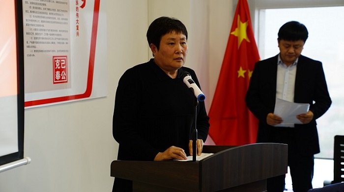 吉林市宜山书店总经理尹鸿艳代表客户发言。她对名师工作室的成立表示祝贺,回顾了与延边大学出版社合作的悠久历史,并表示未来将进一步加强交流合作,以实际行动支持名师工作室教辅图书产品发行工作。