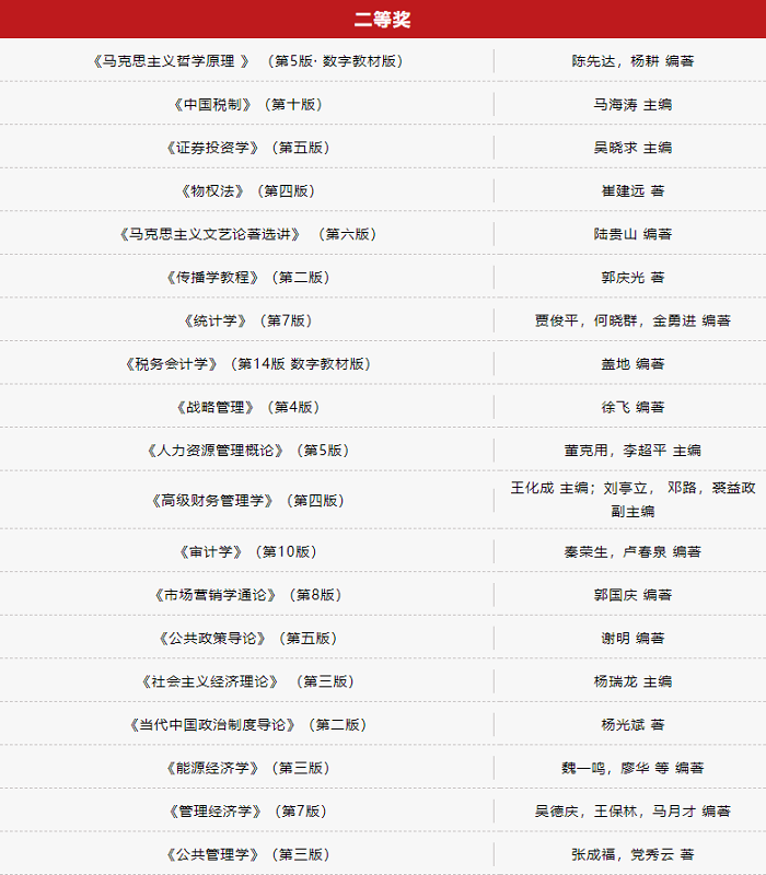 • 经济类教材一等奖共评出6项,中国人民大学出版社获评4项。中国人民大学出版社还获评4项二等奖。其中:金融类教材共评出3项,中国人民大学出版社获评2项。财税类教材共评出2项,中国人民大学出版社获评2项。