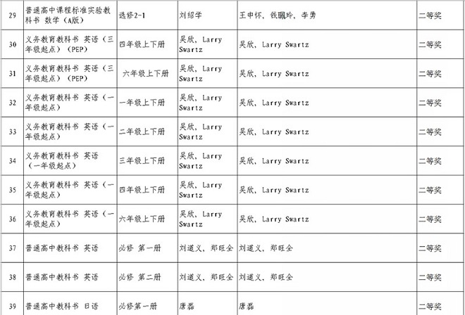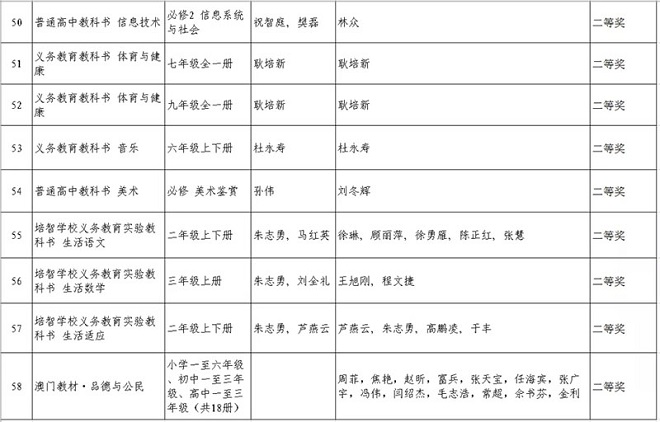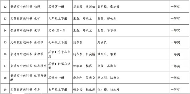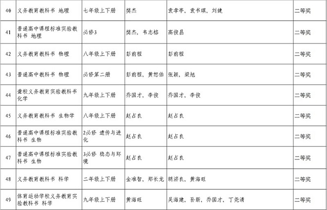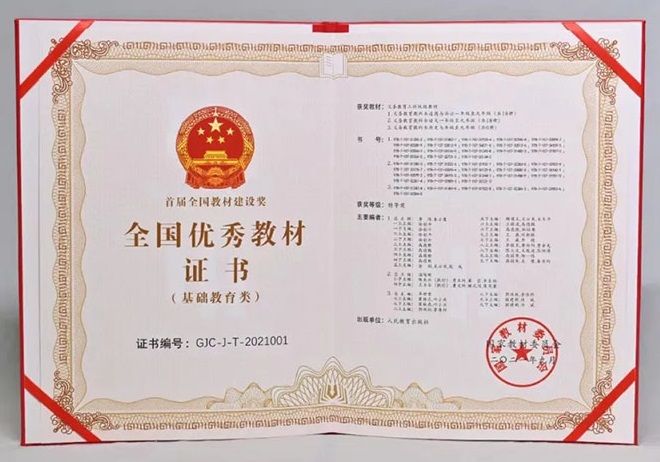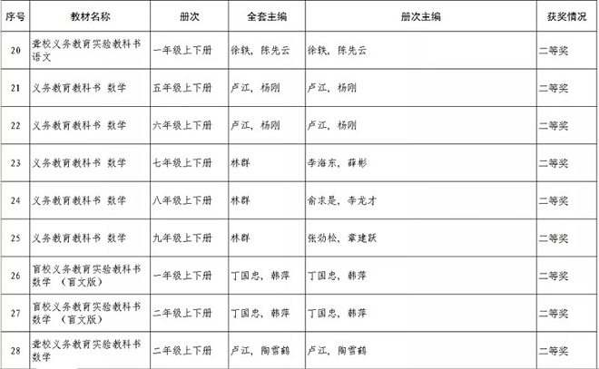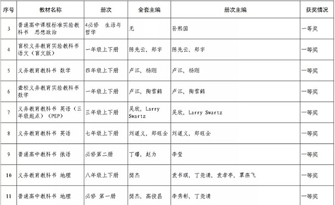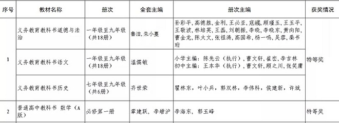 首届全国教材建设奖基础教育类教材评出特等奖3项,其中两项由人教社出版;一等奖40项,人教社入选17种,二等奖157项,人教社有39项。人教社获奖教材覆盖了基础教育阶段的各类型、各学科和各学段。