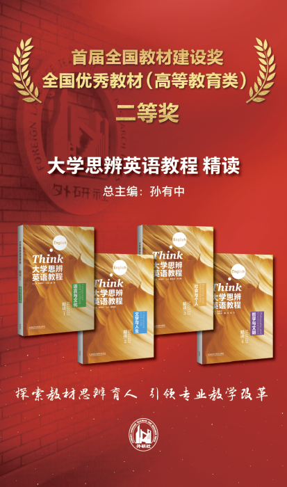 2021年10月12日,全国教材工作会议暨首届全国教材建设奖表彰会在京召开。由北京外国语大学孙有中教授担任总主编、外语教学与研究出版社出版的《大学思辨英语教程 精读》系列教材荣获全国优秀教材(高等教育类)二等奖。
