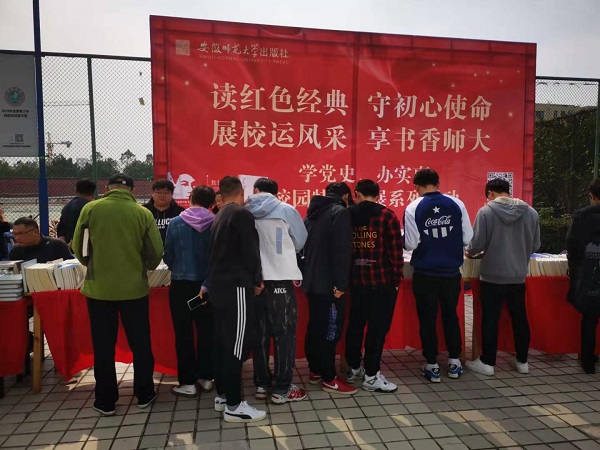 为切实推进为学校师生办实事举措的落实,进一步丰富校园文化生活,同时为助力第五十届校运会的成功举办,2021年10月21日上午8:30,安徽师范大学出版社“学党史 办实事”校园特惠书展系列活动在新校区北体育馆外广场及一食堂、二食堂门口广场拉开帷幕。本次活动以“读红色经典,守初心使命;展校运风采,享书香师大”为主题,300余种精品图书悉数亮相。书展活动形式多样,以超低折扣、集赞享优惠、满减等多种方式回馈读者,为广大师生提供了丰厚的精神食粮。
