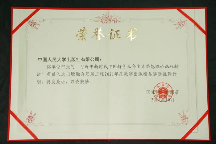 通知公布,20个项目入选2021年度数字出版精品遴选推荐计划,中国人民大学出版社出品的“习近平新时代中国特色社会主义思想概论课程精讲”名列其中。