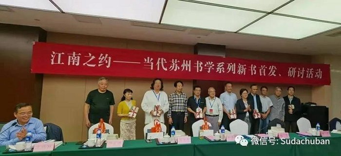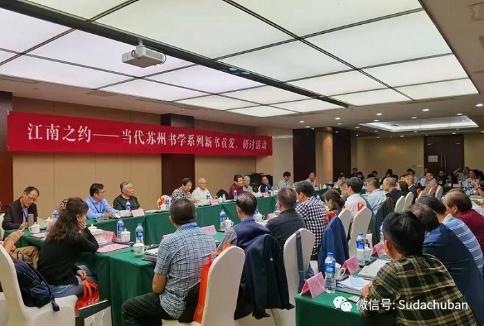 10月14日,由中共苏州市委宣传部、苏州市文学艺术界联合会主办,苏州市书法家协会、苏州大学出版社等单位承办的“江南之约——当代苏州书学系列新书首发、研讨活动”在苏州太湖艺术中心举办。苏州市委宣传部副部长杨芳,原中国书法家协会副主席、全国教育书画协会高等书法教育分会会长言恭达,原中国书协理事、学术委员会副主任周俊杰,苏州大学博士生导师华人德,苏州大学出版社总编辑陈兴昌,书法报社总编辑、《书法报》执行主编毛羽等书法界、出版界、媒体界人士以及书法爱好者60余人出席开幕式。江苏省书协副主席、苏州市书协主席王伟林主持开幕式。