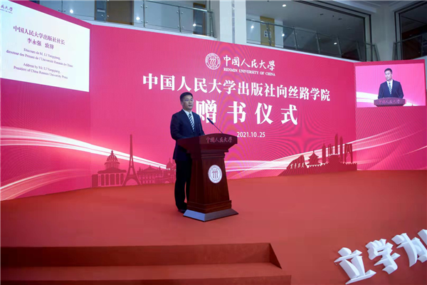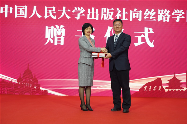 10月25日,中国人民大学出版社向中国人民大学丝路学院赠书仪式在中国人民大学苏州校区开太楼一层大厅举行。中国人民大学副校长、丝路学院院长杜鹏教授,中国人民大学出版社社长李永强、丝路学院副院长兼国际学院副院长江晓丽教授,等出席仪式。仪式由中国人民大学苏州校区管委会副主任兼国际学院、中法学院院长,丝路学院副院长黎玖高主持。