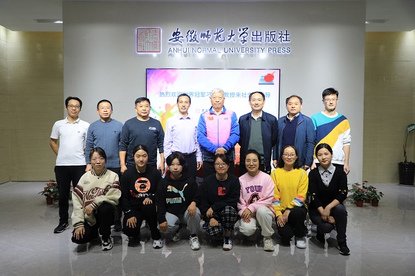 2021年10月27日下午,乒乓球世界冠军刁文元在其学生陪同下莅临安徽师范大学出版社指导交流。安徽师范大学出版社社长张奇才、总编辑戴兆国、副总编辑吴顺安陪同交流。
