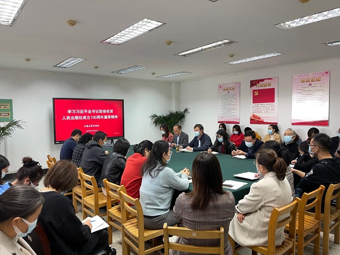 10月27日上午,江苏大学出版社召开学习会,学习习近平总书记祝贺人民出版社成立100周年致信重要精神。江苏大学出版社社长施康和全体员工参加学习会,直属党支部书记、总编辑陈远东主持会议。
