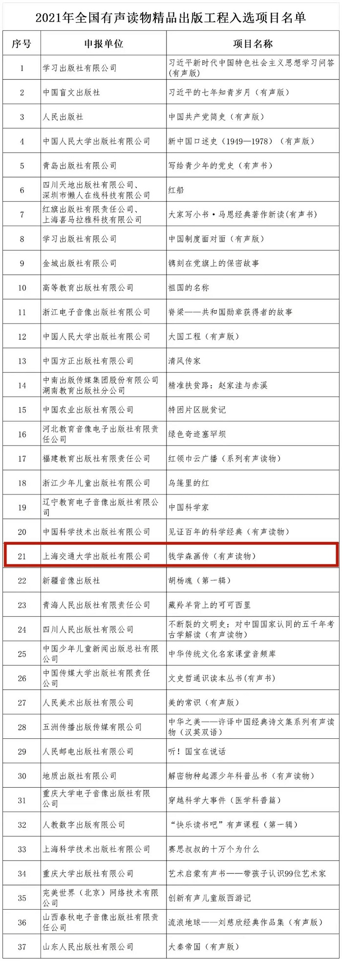 交大社的两次入选精品工程的有声作品《查医生援鄂日记》和《钱学森画传》均为主题出版资源。交大社从主题出版图书中开发优质有声内容,即是对优质内容的深度挖掘,也是对融合出版转型的一种尝试。为出版社提升市场转化能力、提高主题融合和深度开发能力积累实战经验,也为后续交大社进一步开展“创新融合发展,聚焦知识服务”提供了宝贵借鉴。以此为契机,交大社将创作出版更多思想精深、艺术精湛、制作精良的优秀融合出版作品,切实传播优质文化精神,推动出版行业创新发展。 附:2021年全国有声读物精品出版工程入选名单