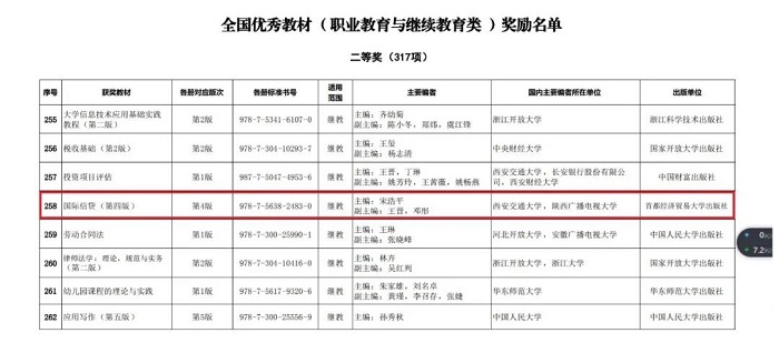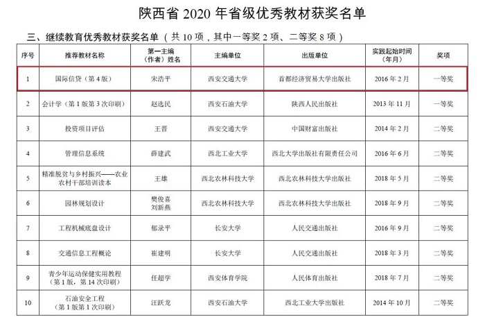 2021年10月12日,全国教材工作会议暨首届全国教材建设奖表彰会在北京召开,对获得首届全国教材建设奖的优秀教材、先进集体和个人进行了表彰。会上,国家教材委员会发布《关于首届全国教材建设奖奖励的决定》,由西安交通大学宋浩平(主编),陕西广播大学王晋、邓彤(副主编)编写的职业教育与继续教育类教材《国际信贷(第四版)》获“全国优秀教材二等奖”。