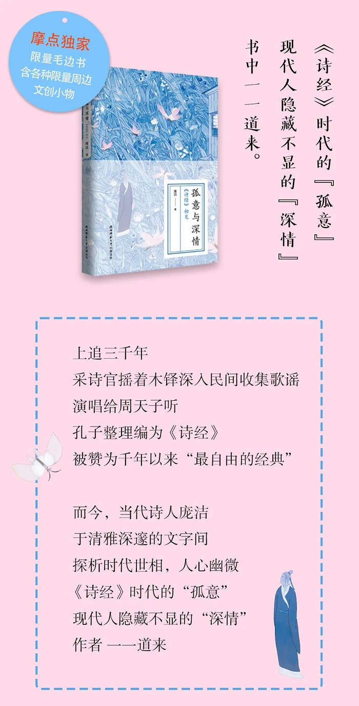 本书的责任编辑焦凌则提到了庞洁对《诗经》中女性形象的分析,提出了与以往很多阐释都不太相同的独到解读,这也是本书的亮点之一。作者于清雅深邃的文字间探析时代世像,人心幽微,展示了《诗经》时代的“孤意”和现代人隐藏不显的“深情”。本书特邀知名插画师木言手绘《卫风·考槃》插画作为封面,为了扩大影响,另制作了500套手作毛边珍藏版,并附赠《诗经》笺谱等文创产品在摩点网独家发售,受到了读者的极大欢迎,上线三天即售罄。