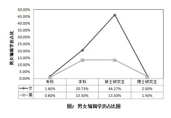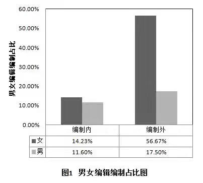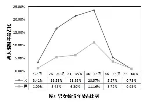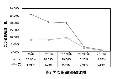 各种福利较完善、编辑压力相对小和投入产出比匹配等,使得喜欢安稳的女性编辑人员不会轻易辞职(如图3所示,6~20年编龄的女性编辑占比为40.59%)。