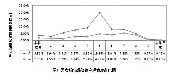 大学出版社中,男女编辑薪资福利满意度占比图如图4所示。