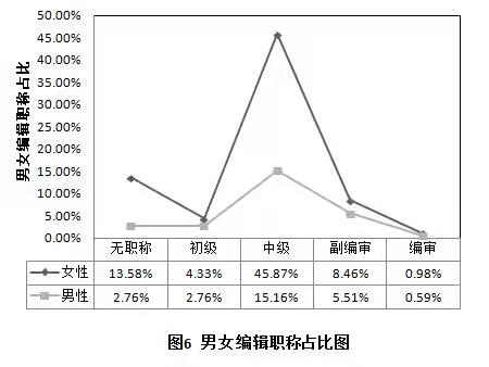 (3)技术职称晋升。编辑人员都非常渴求晋升技术职称。一方面可以提高工资待遇,另一方面能够证明自己的工作能力,被视作资质和鼓励,文化圈内人更看重这种高光荣耀。母体大学应该按照2021年1月28日人力资源社会保障部、国家新闻出版署联合印发的《关于深化出版专业技术人员职称制度改革的指导意见》,增加分配指标(如图6所示,副编审及以上技术职称人员占比为15.54%),克服设置唯学历、唯资历、唯论文、唯奖项等前置硬性必备条件的倾向,将评审重点向把论文写在广袤的祖国大地上的一线出版专业技术人员倾斜,注重评价其能力素质和工作业绩,将选题策划报告、审稿校对意见、设计制作方案和项目等代表性成果作为支撑评审的重要内容,让无暇顾及或弱于撰写论文但“双效”突出的男性编辑理直气壮地拥有成就感和获得感。