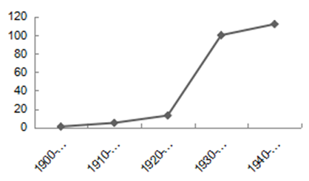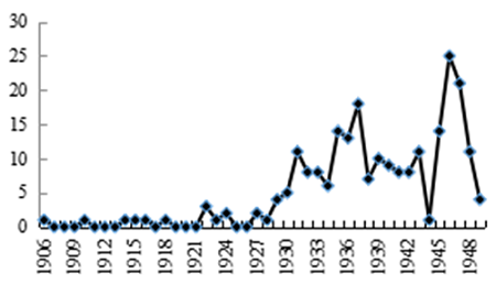 由图1可以看出,从1906年至1930年,每年的出版量只有数种;从1931年开始,有些年份的出版量超过了10种,尤以1937年和1946年为甚,各为18种和25种,而最低的1944年只有1种。