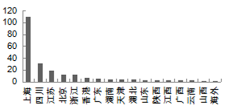 观察刊物的出版地,共有23个地区有读书类报刊。其中上海110种,占46.8%;四川31种,占13.2%;江苏19种,占8.1%;北京和浙江各12种,各占5.1%;香港7种,占3.0%;广东6种,占2.6%;湖南5种,占2.1%;天津和湖北各4种,各占1.7%;山东、陕西、江西、广西、云南各3种,各占1.3%;山西和海外各2种,各占0.8%;安徽、辽宁、福建、贵州、海南和台湾各1种,各占0.4%。图3列出了有2种以上近代读书类报刊的出版地区。
