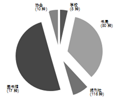 由图可见,报刊社出版的报刊最多,占了总数的一半;其次是书局,出版量占总数的三分之一多。此两者占了出版总量的八成多。然后是图书馆、协会和学校出版的报刊,三者之和为出版总量的一成多。