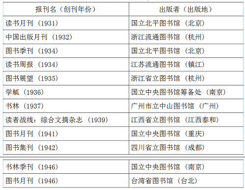 表3为图书馆出版的重要报刊。中国近代一些大的图书馆都有读书类报刊,如国立北平图书馆、浙江流通图书馆、江苏流通图书馆、国立中央图书馆、广州市立中山图书馆、江西省立图书馆、四川省立图书馆、台湾省图书馆等。