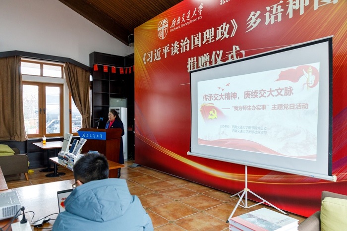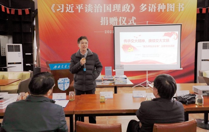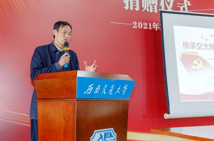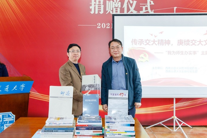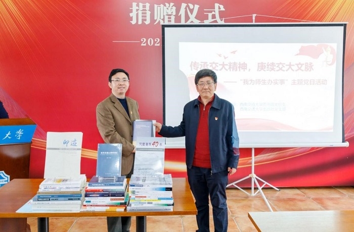 活动伊始,西南交通大学出版社向学校“交大文库”捐赠了2021年以来在学校出版社出版的部分学校老师、校友的图书,参会嘉宾邱建教授、校友王翔高级工程师也将自己或相关的图书作品向“交大文库”进行了捐赠。