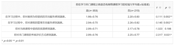 表2 有无网络课程学习经验对满意度影响