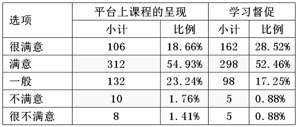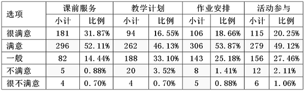 从表3中的数据可以看出各项不满意比例(不满意与很不满意比例加和)均未超过5%。这表明学生对于教学团队的支持服务大部分表示满意,尤其是教学团队在课前为学生提供的指导服务获得了绝大部分人的肯定,但是在教学计划和教师参与活动方面,学生需要其提供更多、更积极的帮助。