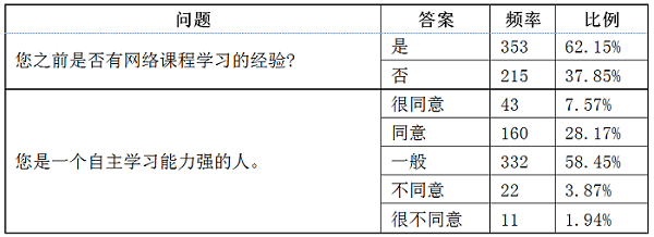 从样本网课学习经验来看,符合“00后”大学生学习特点,超过半数的人进行过网络学习。从样本自主学习能力来看,符合二本类高校生源特点,普遍具有一定的自主学习能力,但是并不强烈。