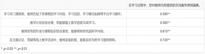为确定教学团队支持服务的综合满意度与教学团队的课前服务、教学计划安排、作业安排及活动参与四项内容满意度的相关性,现用相关分析进行确认,结果如表4所示。