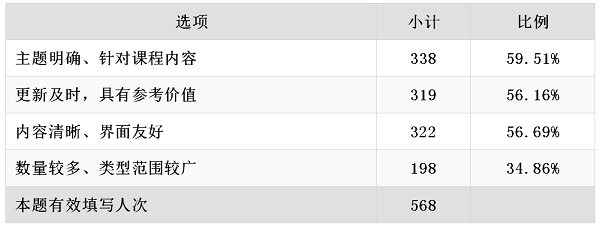 学生对现有资源的评价情况如表8所示。从表8可以看出学生对于前三项评价的认可程度超过半数,对于第四项评价的认可程度仅为34.86%,这表明大部分学生不认为本课程的资源数量较多、类型范围较广,因此为了更好地为学生提供资源支持服务,需要在增加资源数量、丰富资源类型方面做出改善。