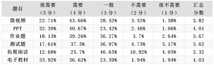 对于该为学生提供哪些类型的学习资源,我们可以从学生对于目前常见的课程资源类型的需求程度调查结果(表9)中进行分析。学生对于各类资源需要比例(需要与很需要比例加和)依次为:微视频66.37%、PPT73.06%、作业题57.39%、测试题55.11%、拓展阅读38.38%、电子教材72.54%。除拓展阅读以外,其余资源的需求比例均超过50%,表明为学生提供这些资源很有必要。将需求程度进行分数换算,对各类资源的需求程度进行分数汇总。从汇总分数中可以看出,学生对于电子教材和PPT的需求程度最高;其次是微视频;再次是作业题和测试题;最后是拓展阅读。在为学生提供资源时应优先提供需求程度高的资源。