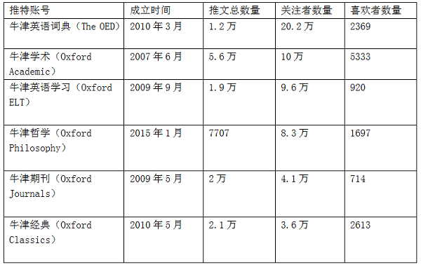 表3 牛津大学出版社关注者数量超过2万的推特账号情况