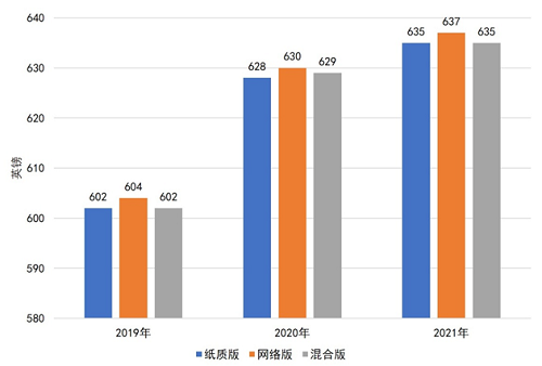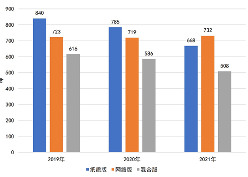 与教育出版物相比,牛津大学出版社学术出版物的数字化程度更高。如图3所示,在牛津大学出版社供机构用户2021年订阅的学术期刊中,网络版期刊数量已经超过纸质版。而且,从2019年到2021年,纸质版和混合版学术期刊数量都直线下滑,而网络版期刊数量上升。从平均订阅价格来看(见图4),纸质版、网络版和混合版学术期刊在2019-2021年间均呈上升态势。并且,网络版期刊价格始终高于纸质版和混合版。根据企业竞争理论,出版社通过引入新技术改善出版产品,以满足市场需求和增加产品附加值,会使得产品功能增强和单价提高。牛津大学出版社正是在改进出版产品功能的同时提升其价格,从而获得竞争优势。