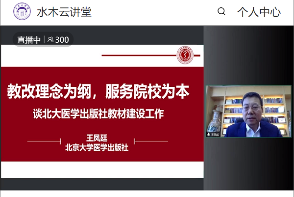 北京大学医学出版社王凤廷社长做题为《教改理念为纲,服务高校为本——谈北医出版社的教材建设工作》的发言,从多维度教材开发和多方位院校服务两角度梳理北大医学社的教材建设思路。多维度教材开发方面,从北医大社开发的教改教材,启智增慧;建设的新形态教材,多元助学;实现教材思政路径,培根铸魂三方面展开论述。多方位院校服务方面,从北医大社坚持院校服务指导思想;助力地方院校教学和教材建设;教材营销与院校服务相结合;电子版教材、在线学习平台助力疫情期间正常教学四方面展开论述。最后,他提出对教材建设的展望:一是,兼顾教材质量与品种扩展;二是,处理好知与魂的关系;三是,挖掘教材呈现形态;四是,探索更多样的院校服务机制。