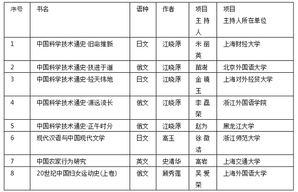 2月8日,全国哲学社会科学工作办公室公布了《2021年度国家社科基金中华学术外译项目立项名单》,在全国数百家出版社选送的项目中遴选出“中华学术外译项目”237个。上海交通大学出版社共有8个项目入选,分别为《中国科学技术通史•旧命维新》(日文)、《中国科学技术通史•技进于道》(俄文)、《中国科学技术通史•经天纬地》(日文)、《中国科学技术通史•源远流长》(俄文)、《中国科学技术通史•正午时分》(俄文)、《现代汉语与中国现代文学》(日文)、《20世纪中国妇女运动史(上卷)》(俄文)、《中国农家行为研究》(英文),项目入选数量位居全国大学出版社第三位,上海地区单体出版社第一位。其中,《20世纪中国妇女运动史(上卷)》(俄文)由上海交大出版社与中国妇女出版社联合申报,《中国农家行为研究》(英文)由上海交大出版社与中国农业出版社联合申报。