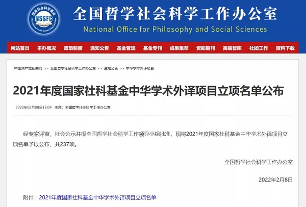 中华学术外译项目是国家社科基金项目的主要类别之一,主要资助代表中国学术水准、体现中华文化精髓、反映中国学术前沿的学术精品以外文形式在国外权威出版机构出版并进入国外主流发行传播渠道,旨在深化中外学术交流与对话,增进世界了解中国和中国学术,增强中国学术国际影响力和国际话语权,不断提升国家文化软实力。