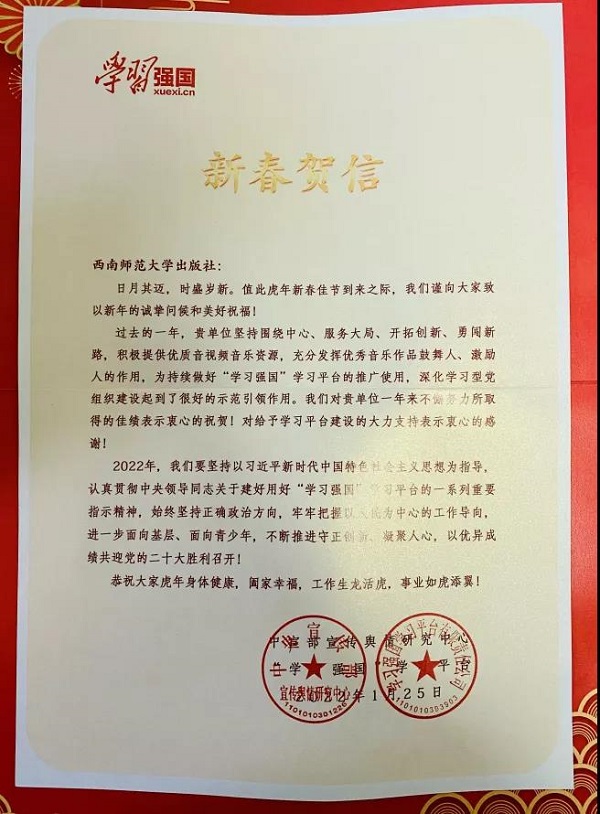 2月7日,西南大学出版社(原西南师范大学出版社)收到中宣部舆情研究中心、“学习强国”平台发来的新春贺信。贺信中表示,“过去一年,西南大学出版社坚持围绕中心、服务大局、开拓创新、勇闯新路,积极提供优质音视频音乐资源,充分发挥优秀音乐作品鼓舞人、激励人的作用,为持续做好‘学习强国’学习平台的推广使用,深化学习型党组织建设起到了很好的示范引领作用”,大力称赞了出版社在2021年为“建好用好学习强国”所作出的突出贡献。