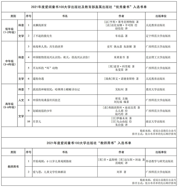 本网讯 近日2021年度“爱阅童书100”书单发布,包括来自2021年1月1日至2021年12月31日首次在国内出版的适合6-12岁儿童阅读的100本优秀童书,以及10本教师用书。7家大学出版社及教育部直属出版社12部优秀图书入选,占比10.91%。