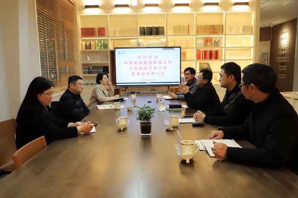 2022年2月22日下午,中国邮政集团有限公司江苏省报刊发行局黄海总经理来南京师范大学出版社交流工作。南京师范大学出版社党委书记、董事长、社长张志刚,党委副书记、副社长张鹏,副社长杨爱东参加了交流会。