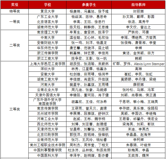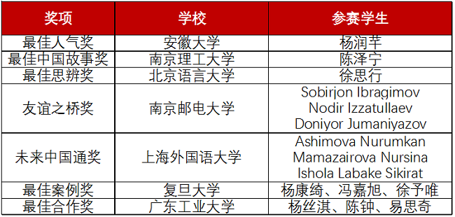 本次大赛全国赛设特等奖、一等奖、二等奖、三等奖,指导教师获相应等级指导教师奖,同时设团队奖包括最佳案例奖、最佳合作奖,单项个人奖包括最佳思辨奖、中国故事奖、最佳人气奖。国际学生团队特设友谊之桥奖和未来中国通奖。最终,由杨康绮、冯嘉旭、徐予唯组成的复旦大学团队夺得大赛特等奖。上海外国语大学国际学生代表队获未来中国通奖。