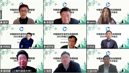 2022年3月5日,中国高校外语学科发展联盟(以下简称联盟)采用线上方式,召开年度工作会议。外国文学跨学科研究委员会、理工类院校委员会、师范类院校委员会、财经类院校委员会、语言学跨学科研究委员会、课程与教材建设委员会、上海外语教育出版社等负责人分别发言,共同总结过去,展望未来。