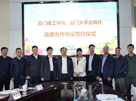 “同饮一江水,鹭江共潮声”,3月9日下午,厦门大学出版社与厦门理工学院举行“战略合作协议签约仪式”。厦门理工学院书记林进川、校长朱文章、副校长兼党政办主任方晓东、教务处处长周水庭、研究生处处长葛晓宏、科研处处长严滨、图书馆馆长林健,厦门大学出版社党总支书记洪秋霞、总编辑施高翔、社长助理欧光江、总编助理陈进才出席仪式。