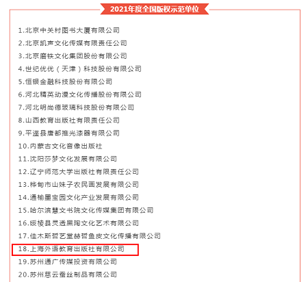 在国家版权局3月4日公布的“2021年度全国版权示范单位、示范单位(软件正版化)和示范园区(基地)名单”中,上海外语教育出版社有限公司(简称“外教社”)被授予“全国版权示范单位”称号。这是外教社继2020年被上海市版权局授予“上海版权示范单位”后获得的又一殊荣。