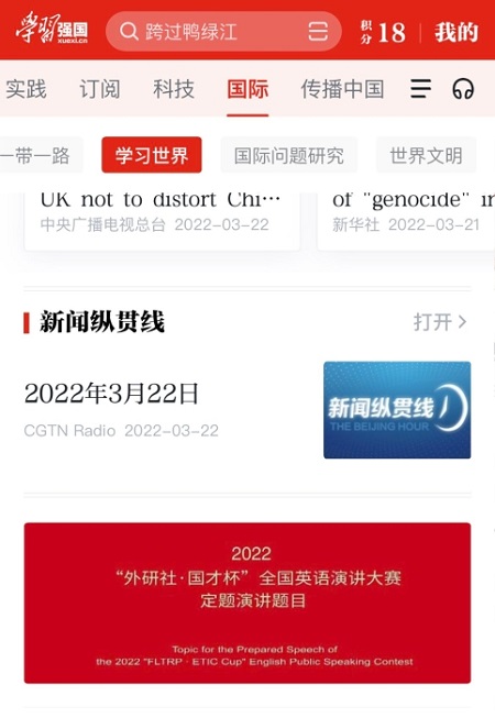 3月21日,2022“外研社·国才杯”全国英语演讲大赛定题演讲题目China's Wisdom for the World(构建人类命运共同体:中国向世界贡献的智慧)登上学习强国APP。