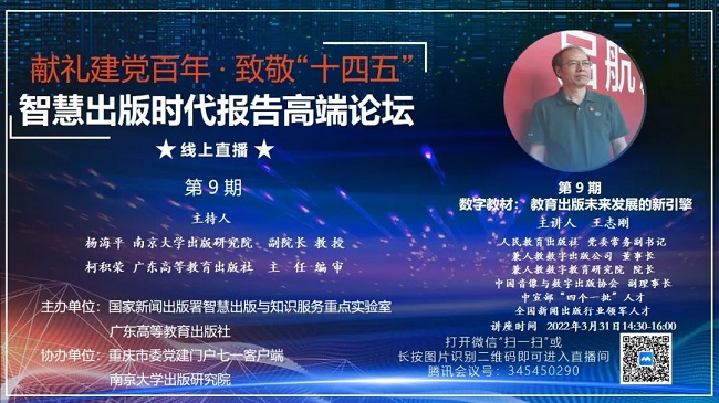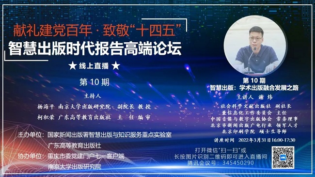本次论坛活动由国家新闻出版署智慧出版与知识服务重点实验室和广东高等教育出版社主办,南京大学出版研究院、重庆市委党建门户七一客户端协办,将分多期持续举行,每场论坛同步视频直播。