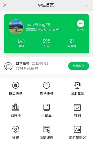 学生端:学习者既可进行词汇自主学习,也可加入教师创建的班级,完成教师发布的任务。