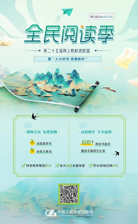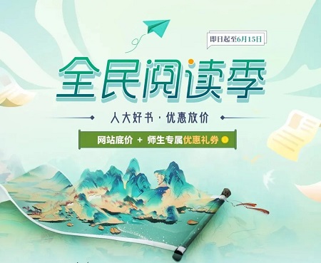 即日起至6月15日,中国人民大学出版社诚意推出第二十五届网上教材进校园暨“全民阅读季·人大好书 优惠放价”专题荐书活动。双重福利,诚意满满。