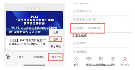 1、电脑端:登录个人中心——自助积分(活动转发),上传截图,审核通过自动增加积分;