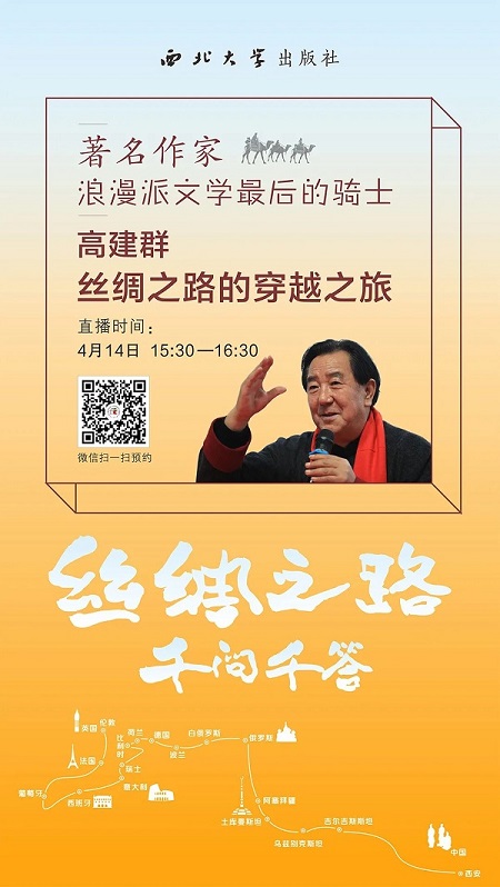 在世界读书日来临之际,著名作家高建群携近作《丝绸之路千问千答》做客西北大学出版社直播间,和大家聊文学,谈创作,讲丝绸之路上张骞、法显、鸠摩罗什、玄奘的故事,讲古代史上不同民族的繁衍生息,讲东西方文化的碰撞与交融。