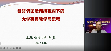 上海外国语大学张健教授通过分析新时代国际传播视阈下的大学英语教学的新问题,以教学翻译为切入点,结合大学外语教材编写的思路和版块特色,研讨了大学英语教学的生态环境、课程教学深度与创新思路。张健教授认为,国际传播视阈下的大学英语教改可以从更新现行英语教材、平衡文学翻译与应用翻译的关系、改进教法三方面入手。