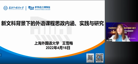 上海外国语大学王雪梅教授剖析了新文科背景下的外语课程思政内涵,并结合教材编写与课堂教学,探索融入式教材编写与教学的理念与模式。王雪梅教授认为,外语课程思政应具有价值引领性、教学融入性、效果可持续性、设计系统性以及动态开放性特点。此外,王雪梅教授还以具体教材与教学活动为例说明如何践行新文科背景下的课程思政,并分析相应研究热点、研究路径等。