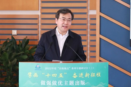 4月12日,由中宣部出版局主办,中国出版传媒商报社承办,外语教学与研究出版社协办的2022年度“出版视点”第三场专题研讨活动在北京举行。活动在北京设立主会场,江苏、云南、广西、陕西、甘肃5地设分会场,以线上线下同步,演讲问答相结合的方式,邀请有关出版管理部门和重点出版单位负责同志,围绕“擘画‘十四五’ 奋进新征程——做强做优主题出版”主题,开展深入研讨。