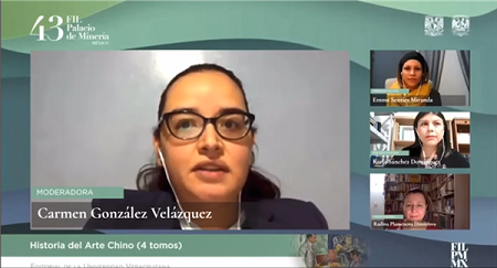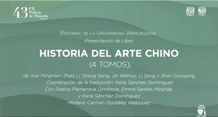 2022年4月1日,中国人民大学出版社《中国美术》西班牙文版新书推介会在墨西哥国立自治大学国际书展举办。本次推介会以线上会议形式开展,由维拉克鲁斯大学出版社编辑卡门·冈萨雷斯·薇拉斯克兹主持,本书的西班牙语译者卡拉·桑切斯·多明格斯,拉迪娜·普拉梅诺娃·迪米特洛瓦,艾玛·森蒂斯·米兰达参加。